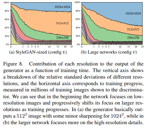 - 아래 그림은 다른 해상도의 표준편차를 학습 시간에 따라 관찰하여 시각화. 이를 생성 이미지의 '기여도'로 해석할 수 있고, 1024 X 1024 해상도의 기여도가 (a)와 (b) 간 차이를 보였음. (a)의 경우 초기 학습에 고해상도 이미지가 기여하다가, 그 정도가 유지되는 것을 볼 수 있지만, 네트워크 사이즈가 더 큰 (b)의 1024 X 1024 해상도의 기여도가 커짐을 알 수 있음.