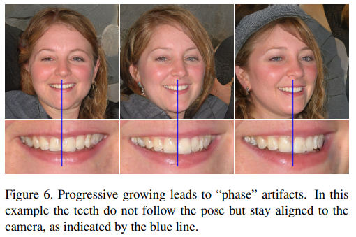 - Progressive growing은 artifact를 만드는 원인. 저해상도에서 고해상도 이미지로 훈련해가나가는 과정에서 네트워크 토폴로지를 확장해나가는데, 그 과정에서 strong location preference가 발생.