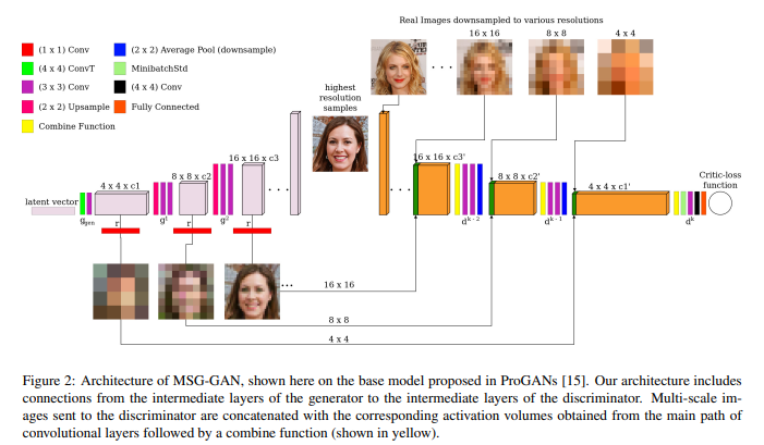 - MSG-GAN (Multi-Scale Gradients GAN): A Network architecture inspired from the ProGAN. The architecture of this gan contains connections between the intermediate layers of the singular Generator and the Discriminator. The network is not trained by progressively growing the layers.