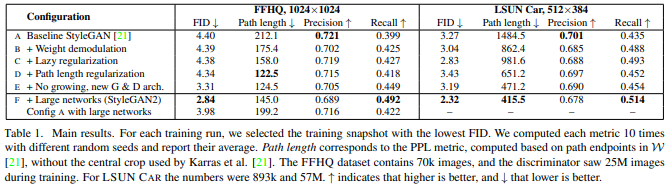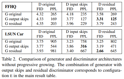 - Progressive growing: 저->고해상도 이미지로 훈련해가며 네트워크를 변경하였는데, 이것이 원인 중 하나로 보임. 저->고해상도 이미지로 훈련하는 것은 유지하되, 네트워크를 변경하지 않는 대신 skip connection이나 resnet과 같은 전략을 취함.