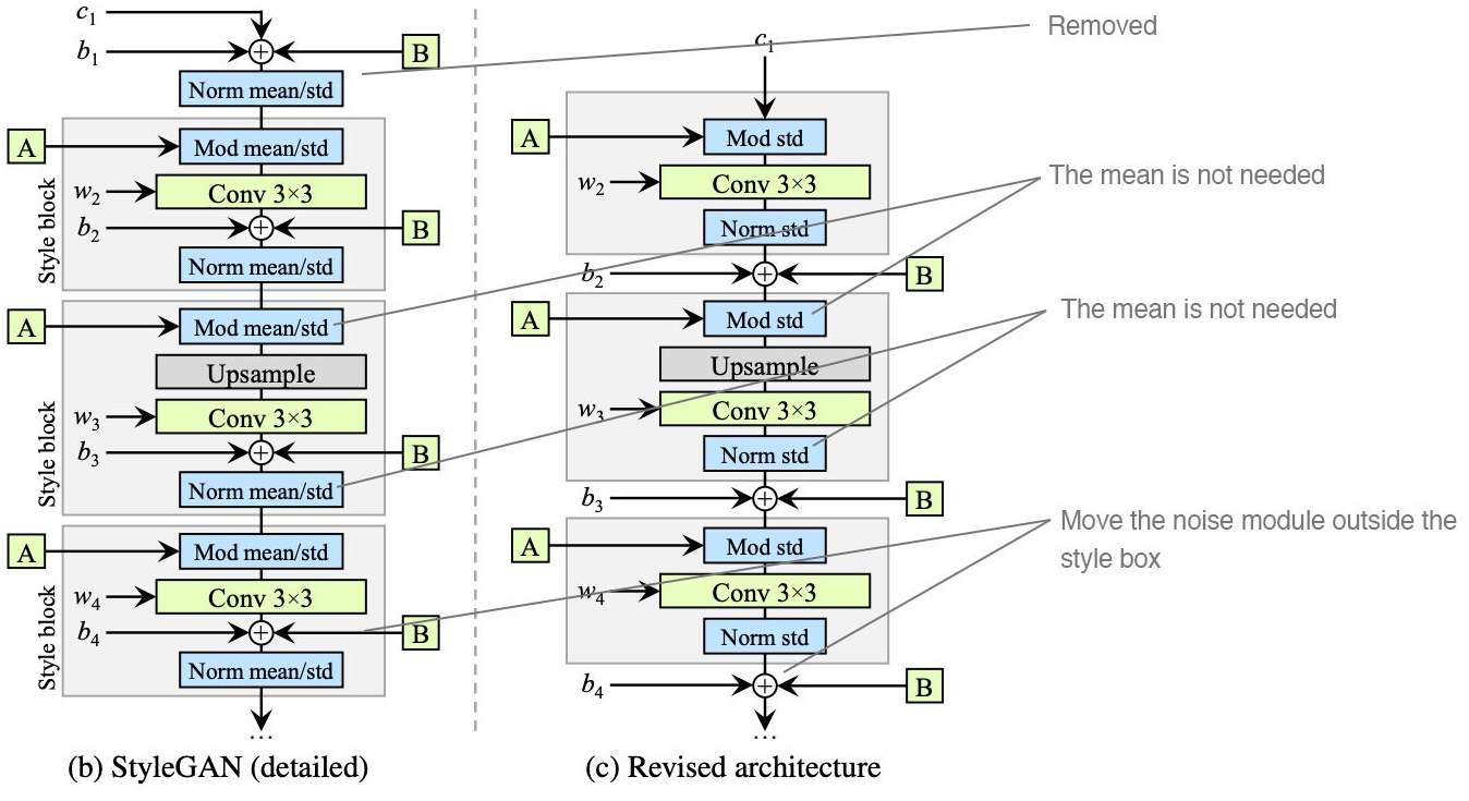 StyleGAN의 artifact가 있음이 보고 됨. 이 artifact의 특징들을 분석하고, 모델과 훈련 방식을 개선: