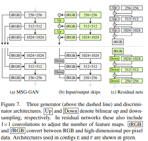 - StyleGAN2에서는 MSG-GAN의 전략을 응용하여 네트워크 토폴로지는 고정하고 various resolution의 훈련 데이터 셋을 각 resolution layer에 넣어주는 skip connections과 residual networks를 실험.