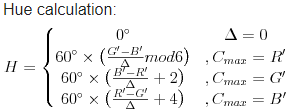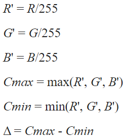 대부분의 이미지들은 RGB로 표현되어 있습니다. 따라서 HSL를 통해 Color jitter을 하기 위해서는 RGB 코드를 HSL로 변경하고, HSL 값들을 약간 변경한 후에 다시 RGB로 변경하는 것 입니다. RGB를 HSL로 변경하는 것은 다음 식을 활용하면 됩니다.