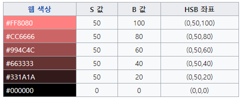 Saturation (채도) 색이 보다 선명할수록 채도가 높다고 말하며 회색이나 흰색 또는 검정과 같은 무채색에 가까울수록 채도가 낮다고 말합니다. 채도가 높은 색을 말할 때는 흔히 '짙다'고 표현하고, 반대로 채도가 낮은 색을 말할 때는 흔히 '흐리다'는 표현을 사용합니다. 0 ~ 100% 사이의 값을 가집니다.